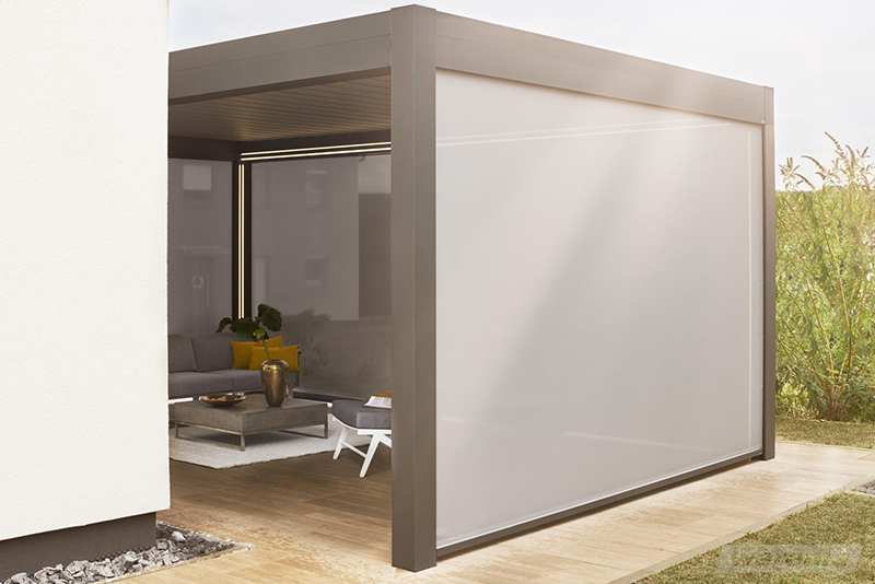 Die gesamte Dachkonstruktion kann mit einer Panorama-Glasschiebewand oder einem festverglasten Element zu einem Kalt-Wintergarten komplett windgeschützt geschlossen werden. Die unterschiedlichen Seitenteile aus Aluminium und Glas werden nach Wunsch individuell zusammengestellt. Hier gibt es die Möglichkeit, zwischen Keilelementen, Seitenwänden mit und ohne Brüstung, Schiebelementen für Seite und Front, Flügeltüren und Ganzglas-Panoramawänden zu wählen. Zudem besteht die Möglichkeit, mit Elektro-Infrarotwärmestrahlern die Innentemperatur zu erhöhen und somit die Terrassenzeit lange in den Herbst ausdehnen zu können. Die Panorama- Schiebewand bietet eine uneingeschränkte Sicht nach draußen, somit kann man die Aussicht auf den eigenen Garten, den Regensburger Dom oder in den Bayerischen Wald in vollen Zügen genießen. Außerdem schützt das Glas-Schiebewandsystem vor Regen, Schmutz und Insekten. Das gehärtete ESG-Glas für die Schiebewand wird überlappt montiert, wodurch eine permanente Belüftung entsteht. Durch eine extra flache Führungsschiene entsteht eine niedrige Schwelle, bietet einen nahezu stufenlosen Durchgang und ist deshalb problemlos für unsere Mitmenschen im Rollstuhl geeignet.